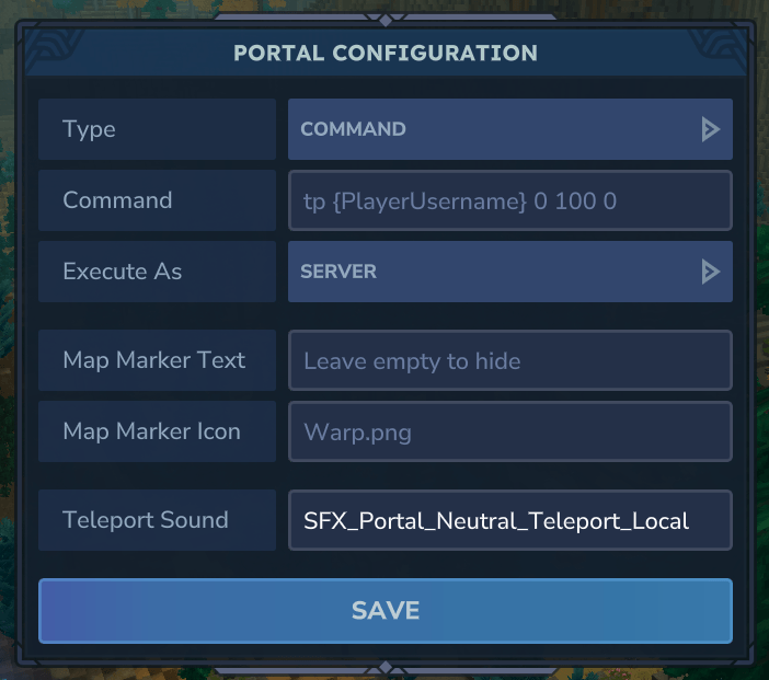 | Teleport Sound | Sound effect ID to play when the portal is activated. Leave empty for no sound (default: SFX_Portal_Neutral_Teleport_Local) |