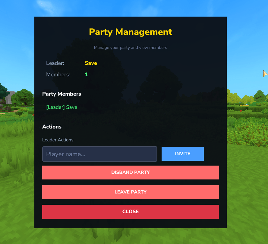 - Party leader controls (invite, kick, manage members)