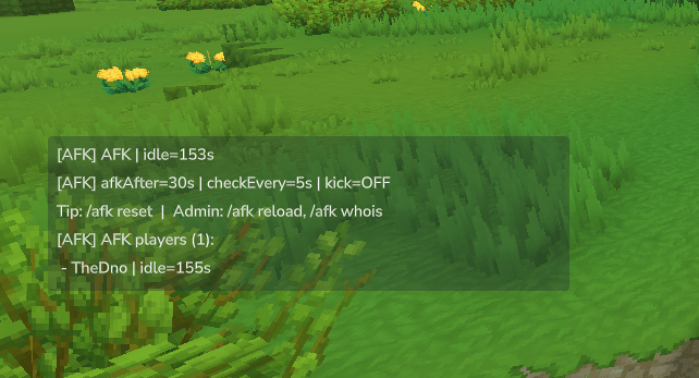 It monitors player activity using horizontal movement sampling, marks players as AFK after a configurable idle period, optionally warns them, and can safely kick idle players using the server’s native command system.