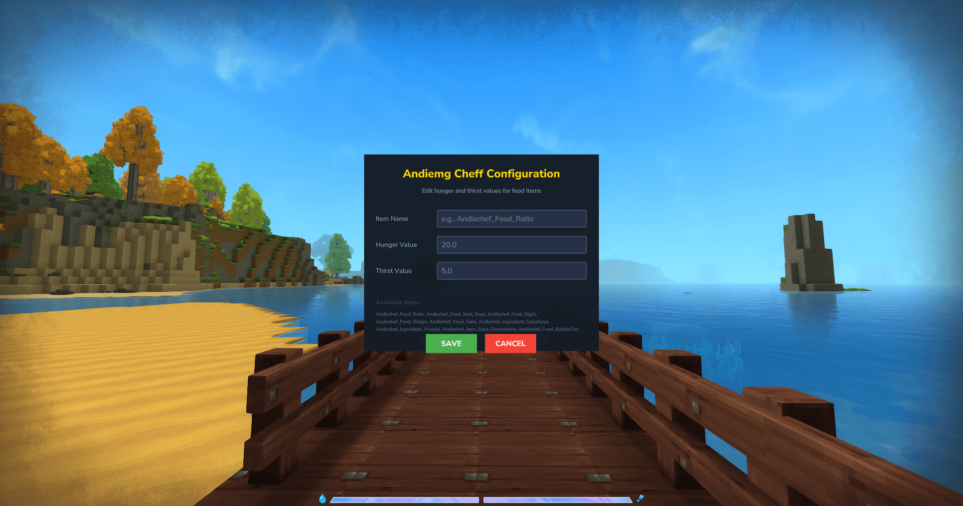 Live Editing: Tweak Hunger and Thirst values for any item while playing.