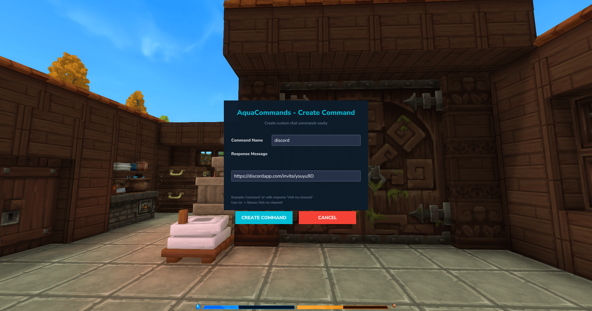 /aquacmd. Enter the desired command name (e.g.,vote) and the message/response. Click Create. - List Commands: Type