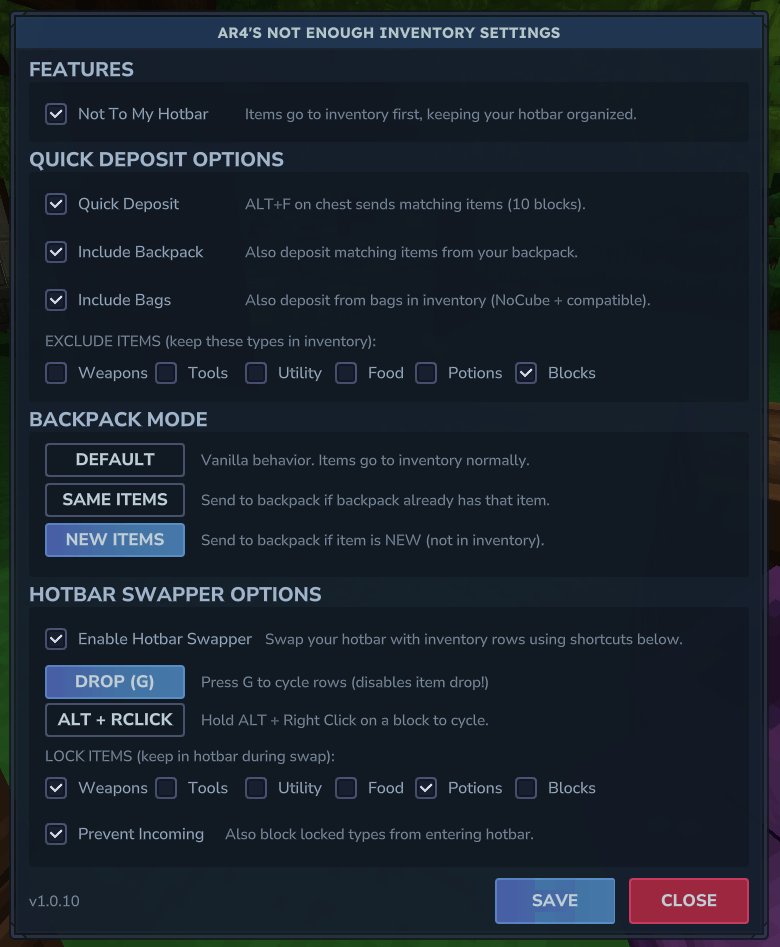 Automatically places matching items you pick up into your backpack, quick deposit to chests, hotbar swapping, and more! Perfect for organizing your gameplay and keeping your inventory clean.