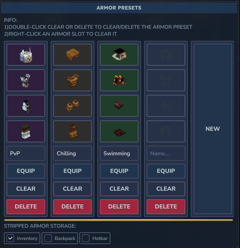 / ArmorPresets - Чтобы сохранить предустановку: В графическом интерфейсе нажмите на слот для брони в предустановке, выберите элемент из своего инвентаря и дайте предустановленному названию. Он будет сохранен автоматически.
