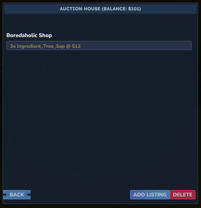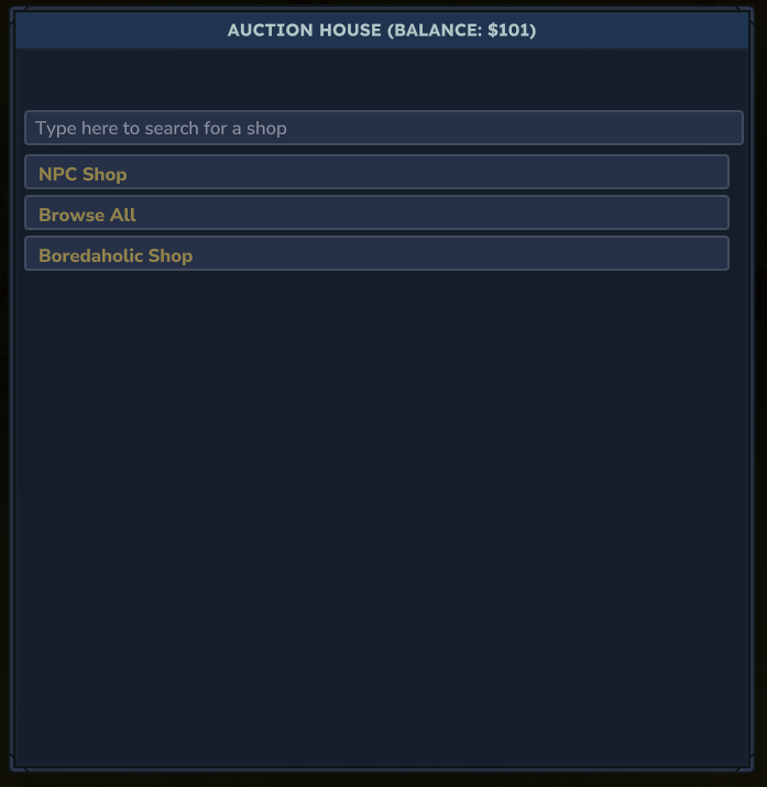 Features player shops and a full browse item list. This is player to player transactions.