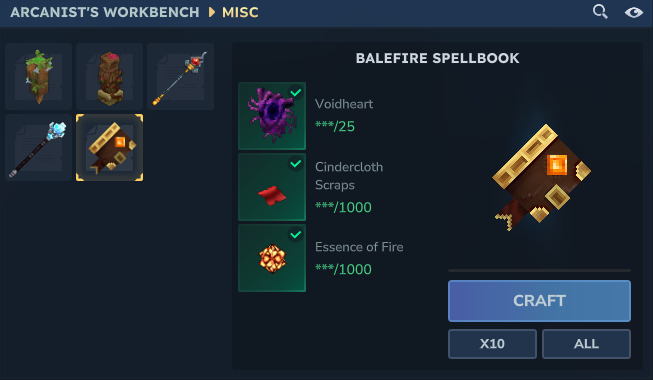 To craft the spellbook, you'll need to combine 25 void hearts, 1000 essence of fire, and 1000 cindercloth scraps inside of the Arcanist's Workbench.