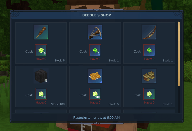With almost 40 different trades, Beedle can offer a wide variety of blocks, food, and armor for you to buy with life essence. You can find Beedle commonly in plains but he can be found in any zone. Just look for that signature backpack and you will find him waddling along.