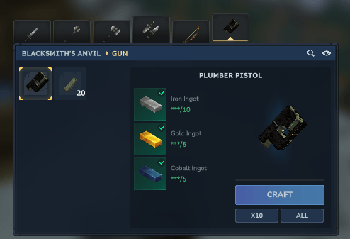 Plumber Pistol: 10 ingots of iron, 5 gold ingots and 5 cobalt ingots.