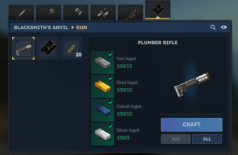 Plumber Rifle: 10 ingots of iron, 10 gold ingots, 10 cobalt ingolts and 3 silver ingots.