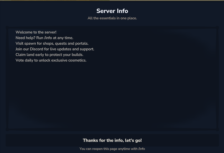 Important information can automatically be shown to players when they join for the first time, ensuring everyone is informed.