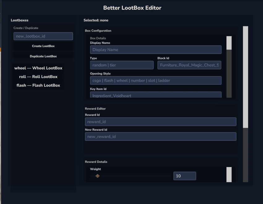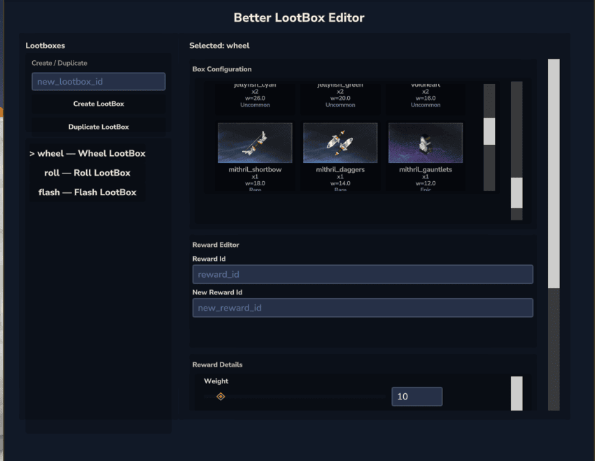 Edit loot boxes directly in the UI, including opening style, tiers, and rewards.