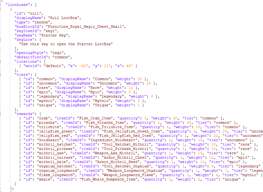Define multiple loot boxes, keys, tiers, rewards, weights, and styles.4