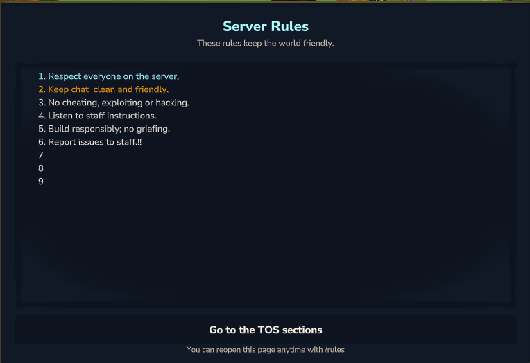 Rules can automatically be shown to players when they join for the first time, ensuring everyone is informed.