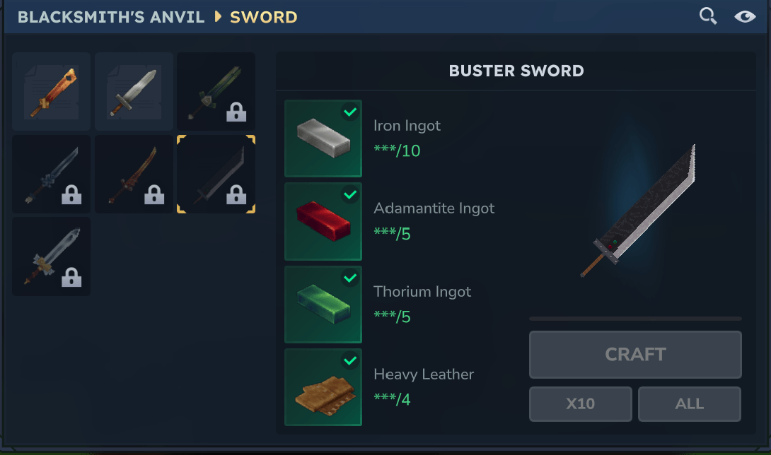 This is an early version of the Buster Sword from Final Fantasy VII. It can be crafted at the blacksmith’s table using 10 iron, 5 adamantite, 5 thorium, and 4 heavy leather. It is about as strong as an adamantite sword.