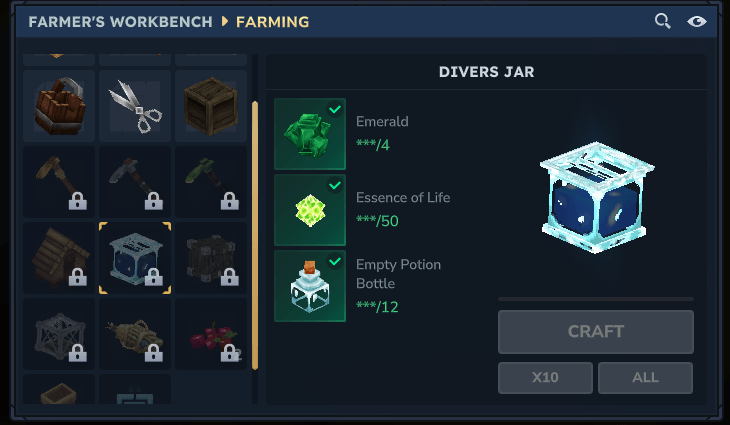 Craftable in the Farmer's Workbench at escalating tiers.