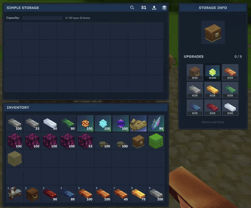 - Click on an item stack from your inventory to move it into the Simple Storage, and click on an item from the Simple Storage to take a full stack out of the system