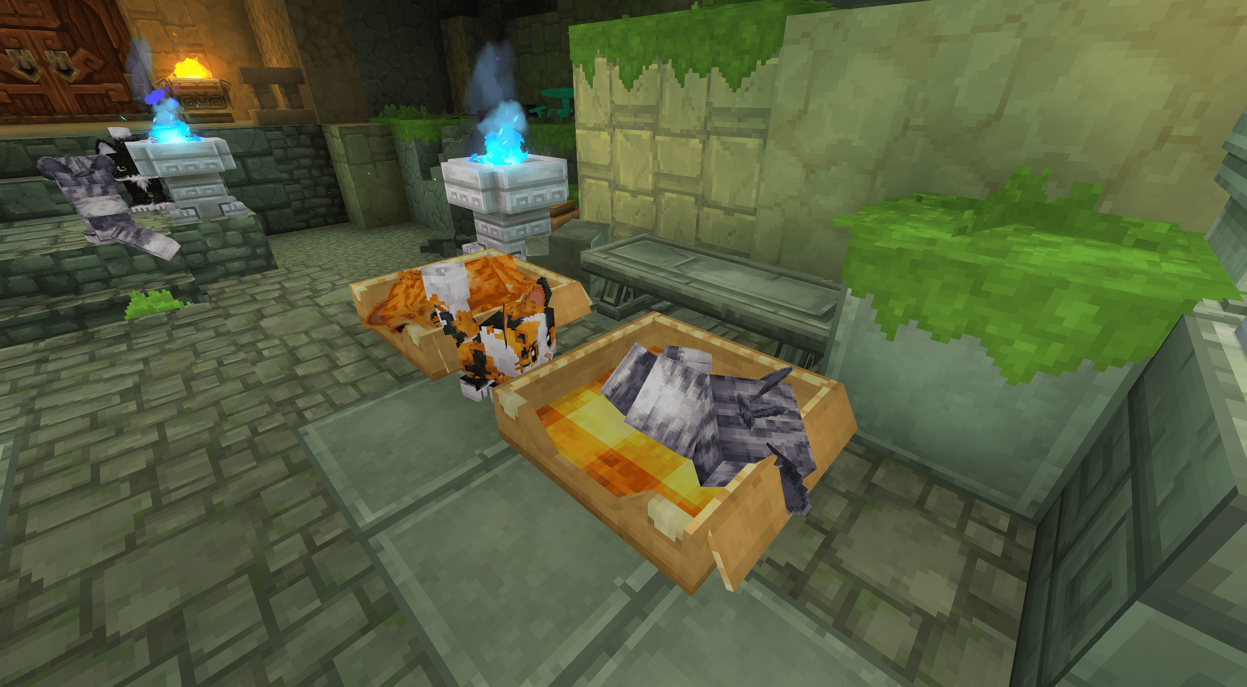 This plugin adds multiple cat breeds that can be tamed, named, and commanded. Cats can follow you on your adventures or stay at home as a cozy companion. Each cat supports multiple behavior states and animations, making them feel alive and responsive.