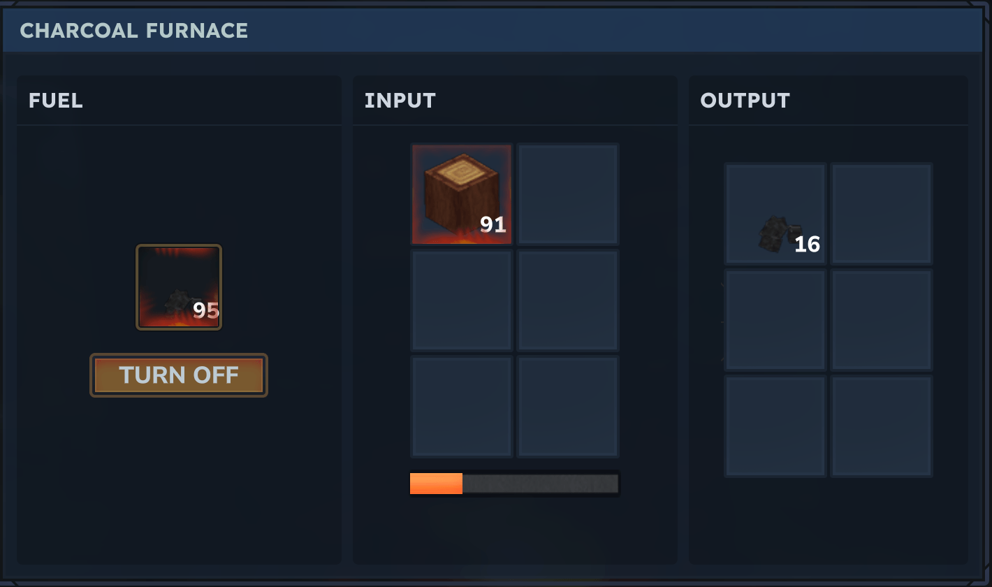 Adds a Furnace to process 1 Wood Trunk into 2 Charcoal