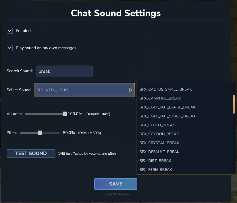 Plays a sound from Hytale's sound library to alert when you receive a chat message, customizable by the player.