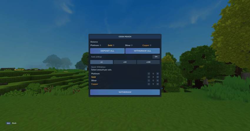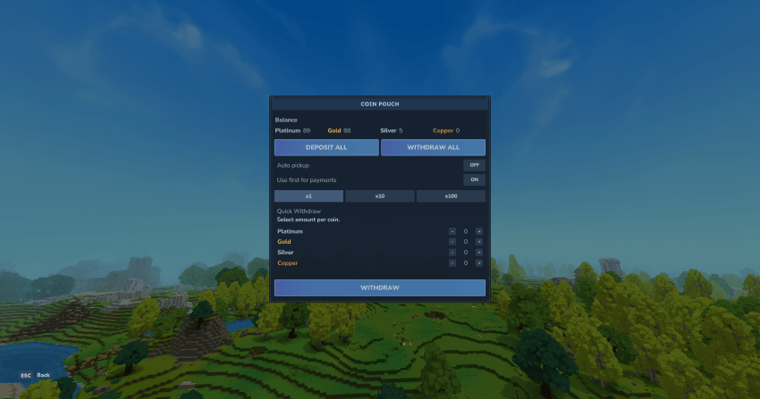 - Default exchange: 1 Silver = 100 Copper, 1 Gold = 100 Silver, 1 Platinum = 100 Gold (configurable)