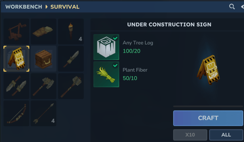 Makes the WIP construction sign craftable for 20 logs and 10 fiber.