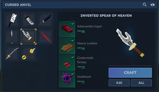 Каждый Проклятый инструмент могут быть изготовлены в Проклятая наковальняНовая крафтовая скамейка. Некоторые Проклятые инструменты Они будут изготовлены из нетипичных материалов, чтобы продолжать создавать увлекательно и весело.