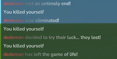 { "messages": [ "<gradient:#F45454:#B65454>{player}</gradient> <gradient:#7B7B7B:#FFFFFF>has met their unfortunate demise!</gradient>", "<gradient:#F45454:#B65454>{player}</gradient> <gradient:#7B7B7B:#FFFFFF>decided to try their luck... they lost!</gradient>", "<gradient:#F45454:#B65454>{player}</gradient> <gradient:#7B7B7B:#FFFFFF>has left the game of life!</gradient>", "<gradient:#F45454:#B65454>{player}</gradient> <gradient:#7B7B7B:#FFFFFF>tried to respawn IRL!</gradient>", "<gradient:#F45454:#B65454>{player}</gradient> <gradient:#7B7B7B:#FFFFFF>forgot this isn’t creative mode!</gradient>", "<gradient:#F45454:#B65454>{player}</gradient> <gradient:#7B7B7B:#FFFFFF>pressed the wrong button!</gradient>", "<gradient:#F45454:#B65454>{player}</gradient> <gradient:#7B7B7B:#FFFFFF>found out the hard way!</gradient>", "<gradient:#F45454:#B65454>{player}</gradient> <gradient:#7B7B7B:#FFFFFF>thought they were immortal!</gradient>", "<gradient:#F45454:#B65454>{player}</gradient> <gradient:#7B7B7B:#FFFFFF>speedran their own death!</gradient>", "<gradient:#F45454:#B65454>{player}</gradient> <gradient:#7B7B7B:#FFFFFF>forgot to read the tutorial!</gradient>", "<gradient:#F45454:#B65454>{player}</gradient> <gradient:#7B7B7B:#FFFFFF>made a very bad decision!</gradient>", "<gradient:#F45454:#B65454>{player}</gradient> <gradient:#7B7B7B:#FFFFFF>was built different… incorrectly!</gradient>", "<gradient:#F45454:#B65454>{player}</gradient> <gradient:#7B7B7B:#FFFFFF>tested gravity. Gravity won!</gradient>", "<gradient:#F45454:#B65454>{player}</gradient> <gradient:#7B7B7B:#FFFFFF>learned why helmets exist!</gradient>", "<gradient:#F45454:#B65454>{player}</gradient> <gradient:#7B7B7B:#FFFFFF>tried to clutch. Failed!</gradient>" ]}