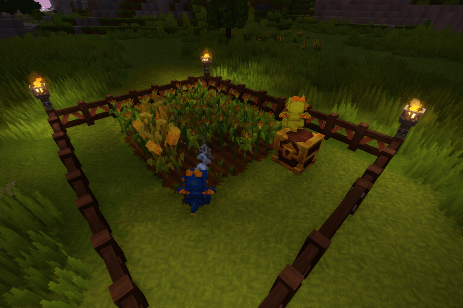 Зеленый дракон Найденные в лесных биомах, эти драконы, ориентированные на природу, автоматически собирают урожай и откладывают его в сундуки при выщелачивании.