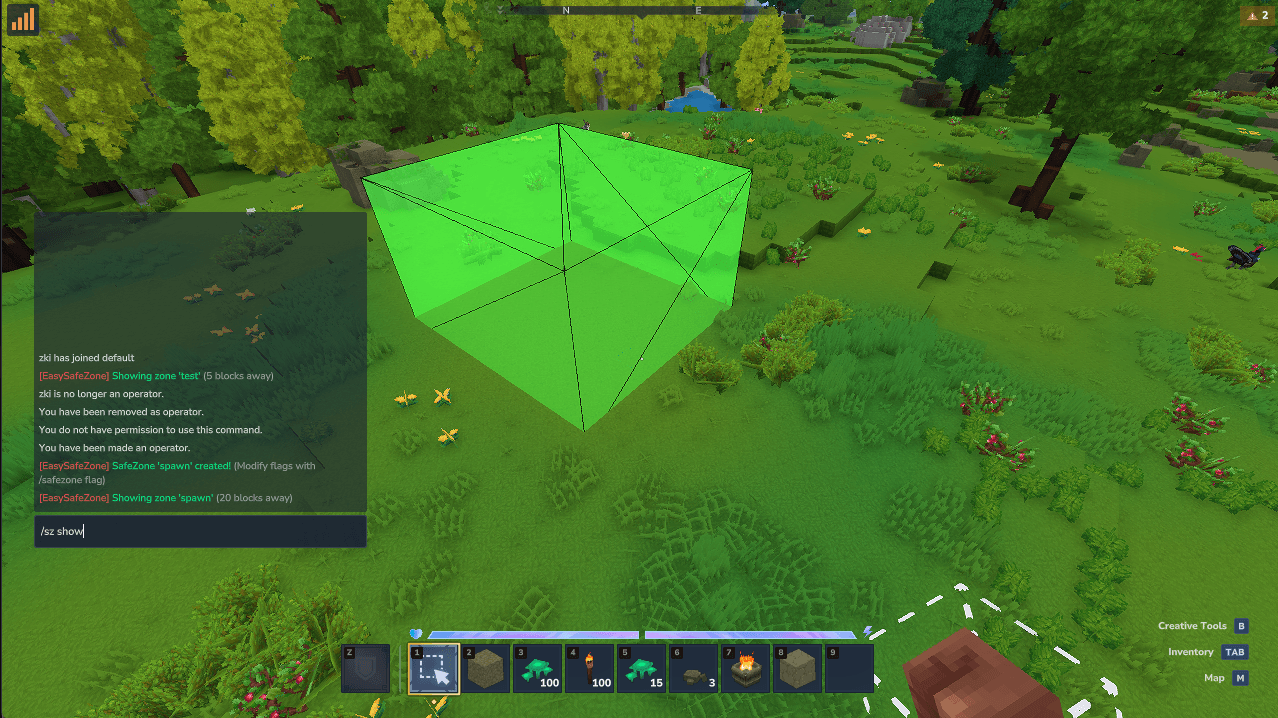 easy-safezone.bypass.all- Ignroes all restrictions.easy-safezone.bypass.pvp- Can attack in safe zones.easy-safezone.bypass.break- Can break blocks in protected zones.easy-safezone.bypass.place- Can place blocks in protected zones.easy-safezone.bypass.use- Can interact with objects in protected zones.