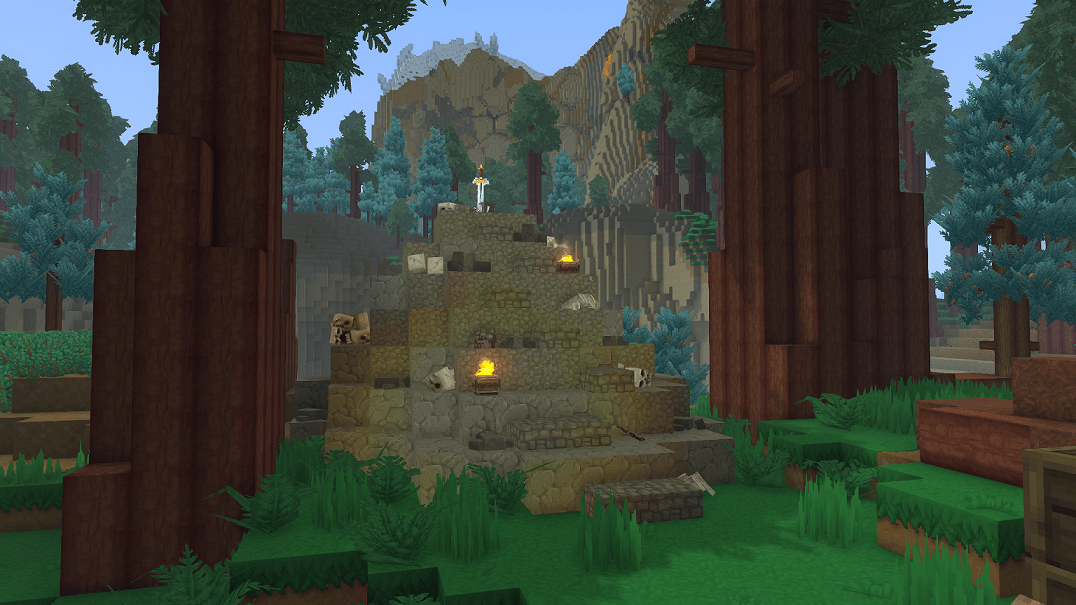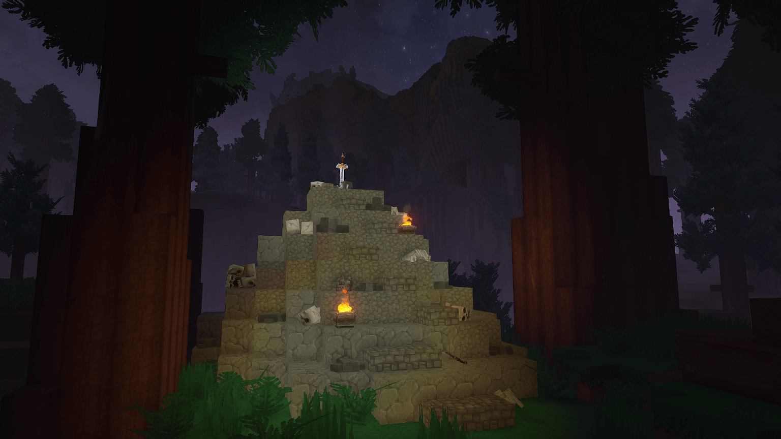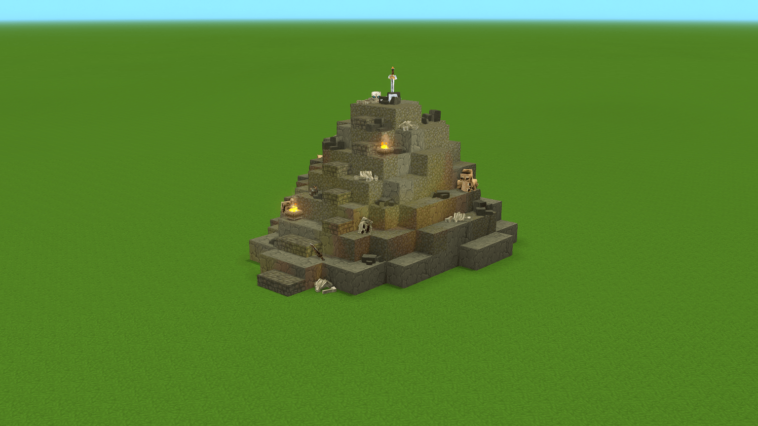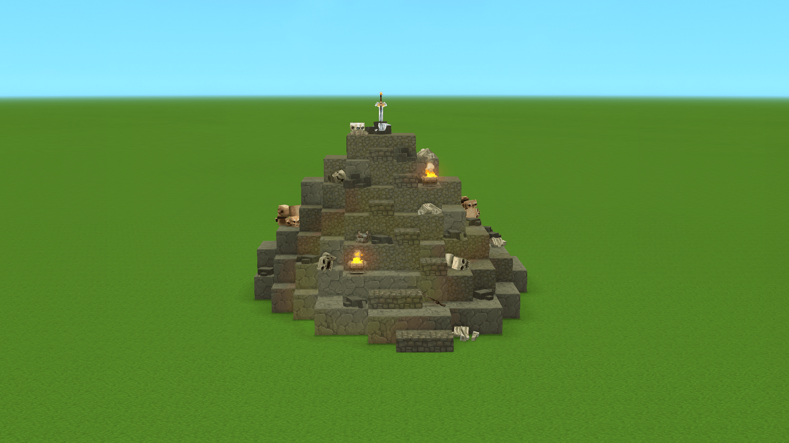 Этот большой камень загорается как огнем из жаровней, освещенных неизвестными людьми, так и жуткой магией, которая, кажется, исходит от легендарного меча на вершине. Кости, древнее оружие и доспехи разбрасывают большую скалу, как будто здесь велось много ужасных сражений. Сколько людей погибло за возможность править. Сотни? Тысячи? Меч застрял... в ожидании...