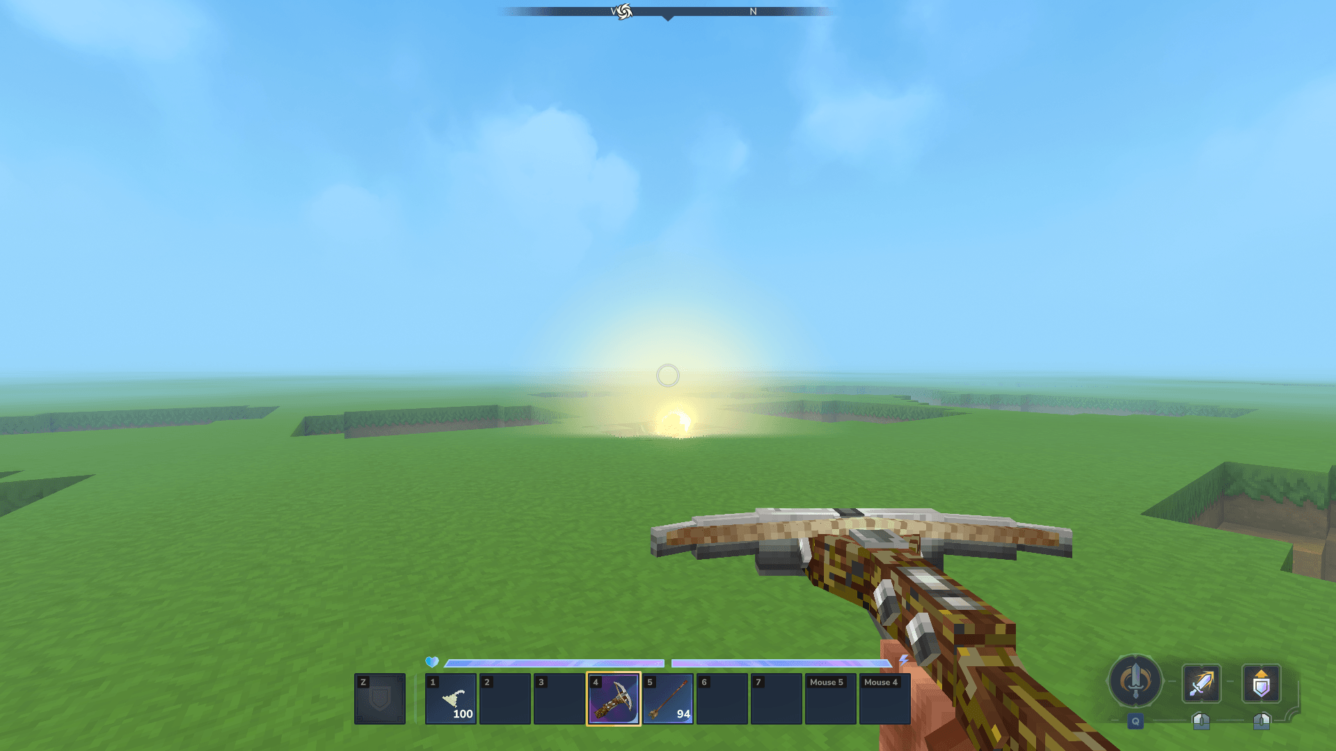 The crossbow behaves like a traditional ranged weapon, but with explosive projectiles that reward accuracy and positioning.