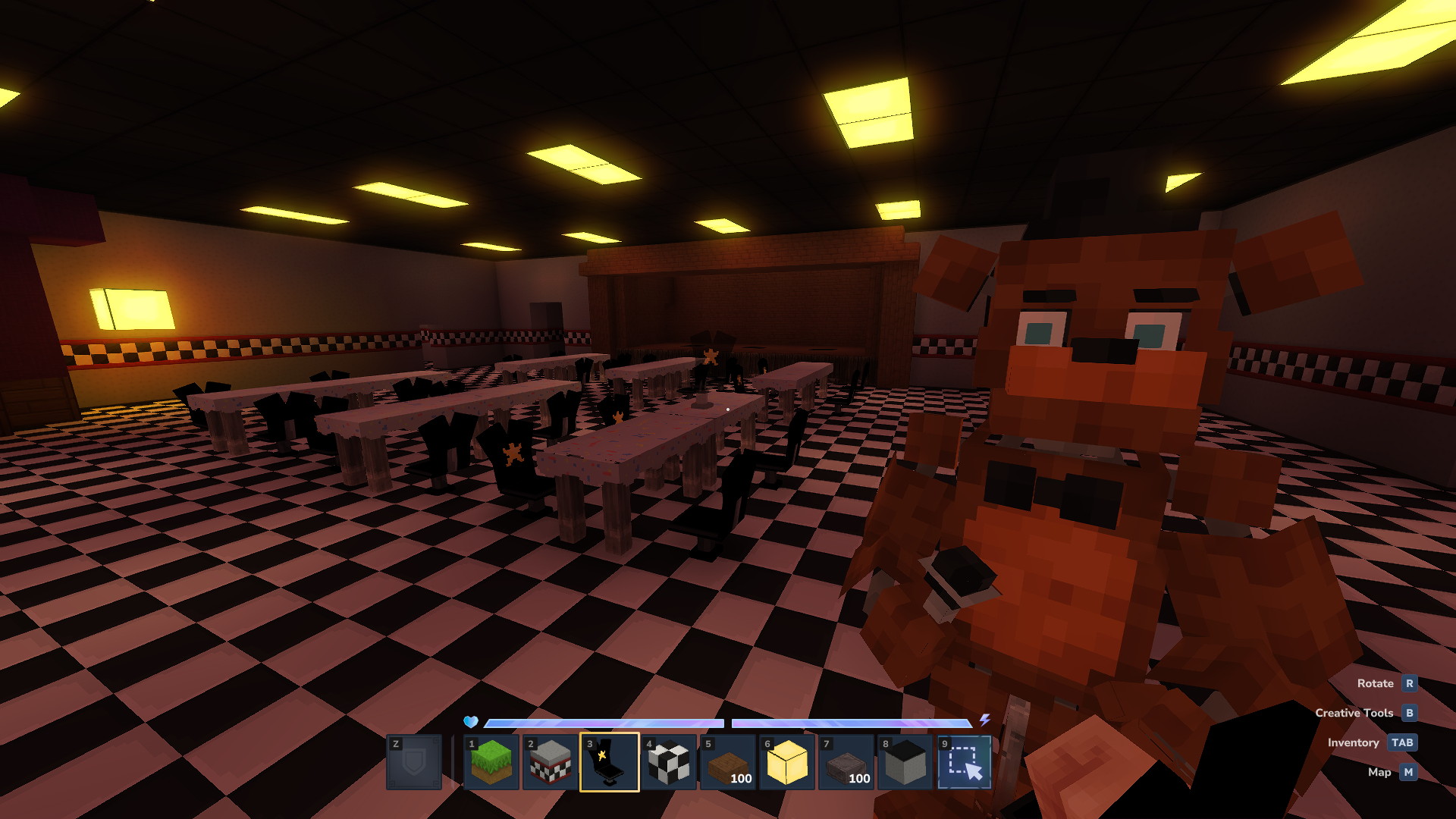 В настоящее время только творческий, но обеспечивает кучу украшений и некоторые очень работы в прогрессе аниматроники. Ищите «FNaF» в творческом инвентаре, чтобы найти большинство блоков.