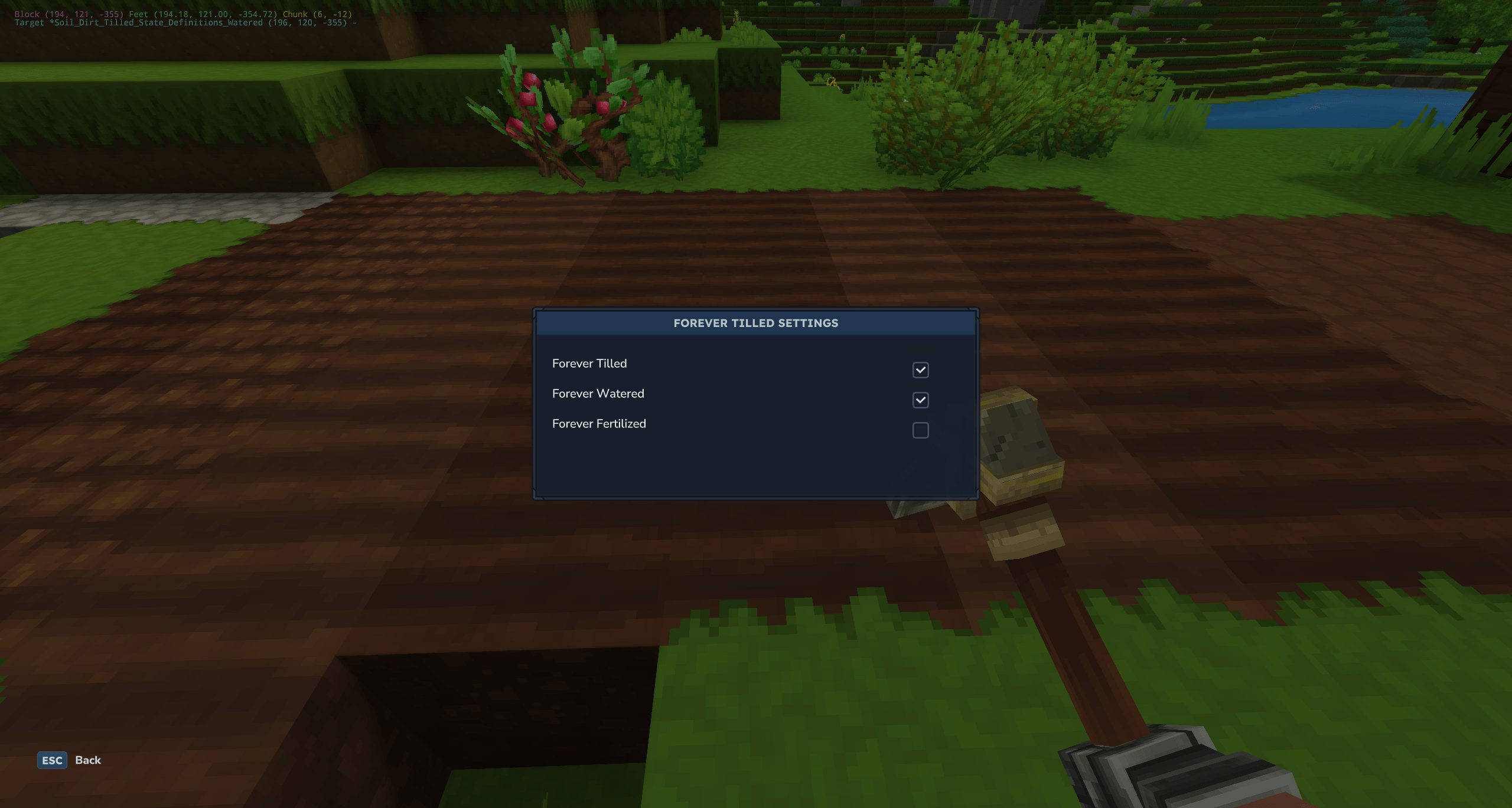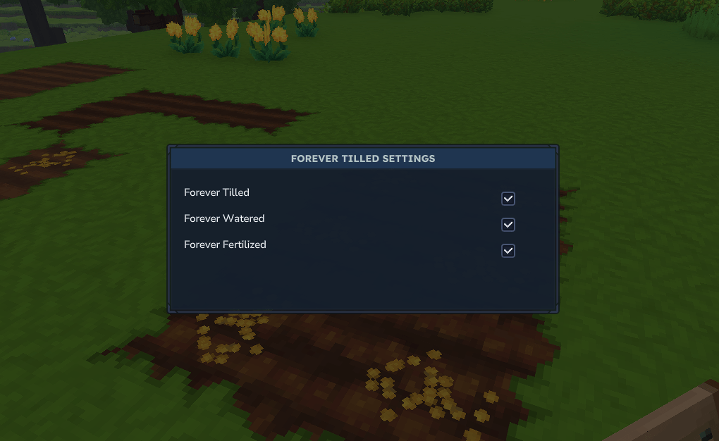 - Forever Watered - (Default on) Keeps your farmland hydrated without the need for nearby water sources or manual watering.