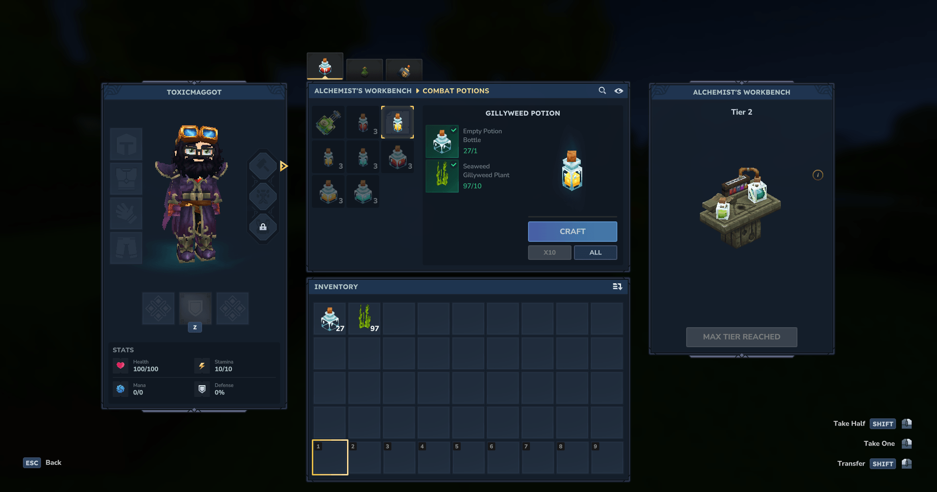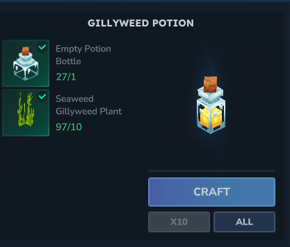 Master the depths! The Gillyweed Potion grants 5 minutes of underwater breathing and boosted swimming speed. An essential Epic-tier item for oceanic exploration. Crafted at the Alchemy Bench. Dive deep, stay safe!