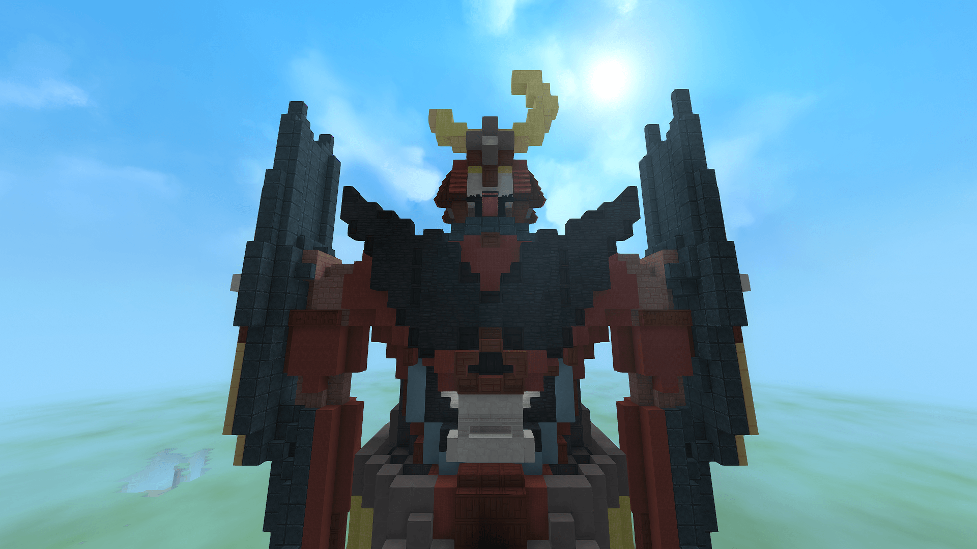 This build of Gurren Lagann is a close to 1:1 scale accurate build from the show Gurren Lagann. This build features two cockpits with seats located in the head and the torso to replicate the ones seen in the show. You can enter these places by going through the trap door on the top of the head or from the back of the waist through a door. The close accuracy to the show should satisfy any Gurren Lagann fans needs for a scale accurate Gurren Lagann in their world.