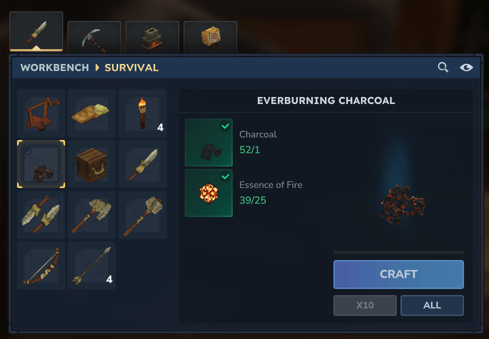 Чтобы создать Everburning Charcoal, вам нужно разблокировать рабочий стол Tier 2. Рецепт требует 1 обычный уголь и 25 огненных эссенций. После изготовления поместите его в свой топливный слот для печи, где он будет гореть очень долго - достаточно долго, чтобы вам фактически никогда не нужно было заправляться во время обычного игрового процесса.