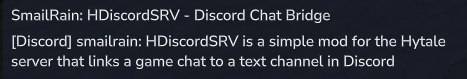 HDiscordSRV is a simple mod for the Hytale server that links a game chat to a text channel in Discord. Messages from the game are sent to Discord, and messages from Discord are sent to the players in the game.