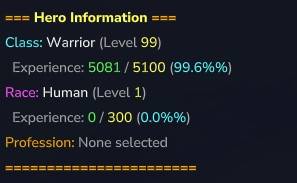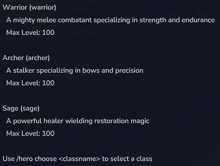 /hero– Main help menu/hero info– Full character overview/hero paths– Available class paths/hero choose– Choose or switch class/hero class | race | profession– View details/lvl– Quick level overview/boost– View active EXP boosts/hero reset– Reset character (permanent)