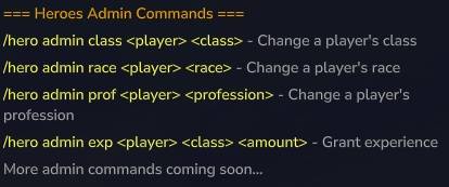 /hero admin– Admin command menu- Manage class, race, profession, EXP, and levels