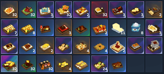 Beef Well Don, Pizza Flatbread, Veggie Pizza, Irish Nachos, Berry Glazed Cod, Birthday Cake, Burger and Fires, Chicken Buttered, Chocolate Swissroll, Egg Toast, Meat Toast, Fish Tocos, Fish Tacos with Corn Tortillas, Fired Chicken Dinner, General Whos Chicken, Hamburger Steak, Butter, Sugar, Minced Meat Cutlets, Omelette Fried Rice, Pork Cutlet Sandwhiches, Cheesecake, Saucy Katsudon, Steak Dinner, Steak Tower, Sushi Platter, Twice Baked Potatos, Wings and Fries, Hot Dogs, Fajita Skillet, Spaghetti, Cheese Steaks, Mac N Cheese, and more to come!