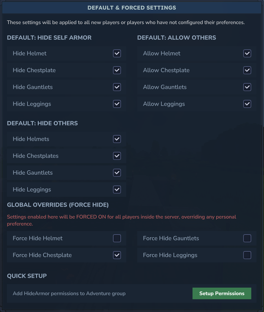 /hidearmoradmin) - Default & force override settings