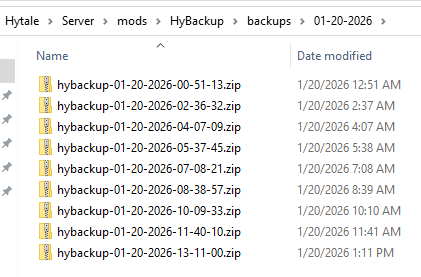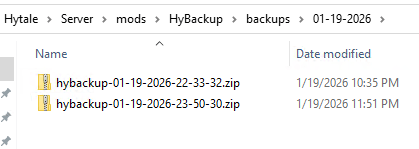 mods/HyBackup/backups/MM-dd-yyyy/hybackup-MM-dd-yyyy.zip(replaceSameDay = true)mods/HyBackup/backups/MM-dd-yyyy/hybackup-MM-dd-yyyy-HH-mm-ss.zip(replaceSameDay = false)