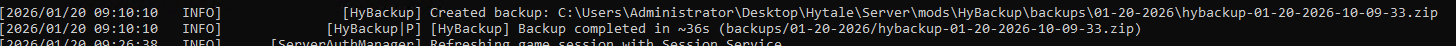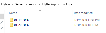 HyBackup automatically backup your Hytale server. Schedule daily or interval backups. archives are saved as .zip in mods/HyBackup/backups/ (one folder per day).