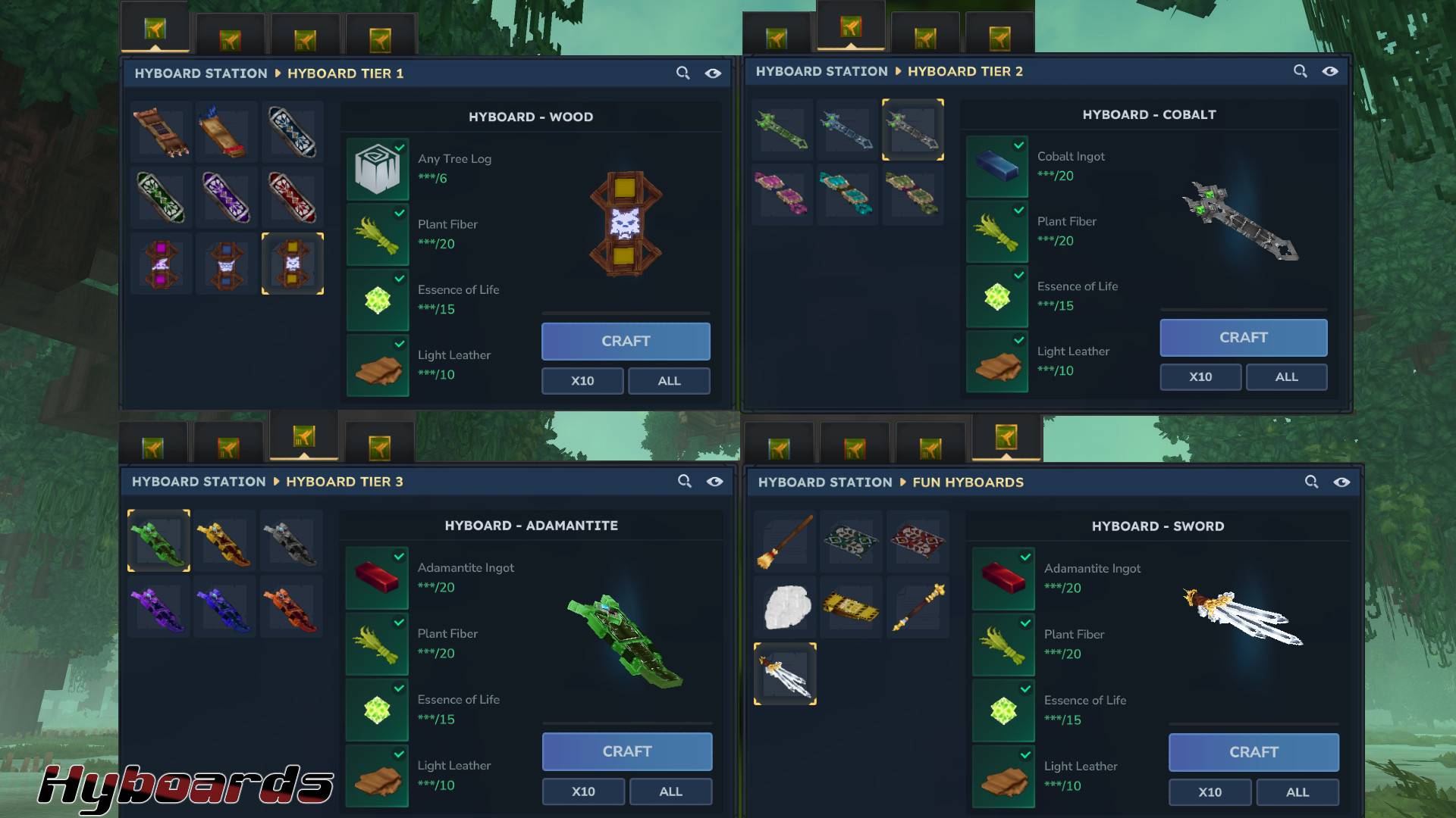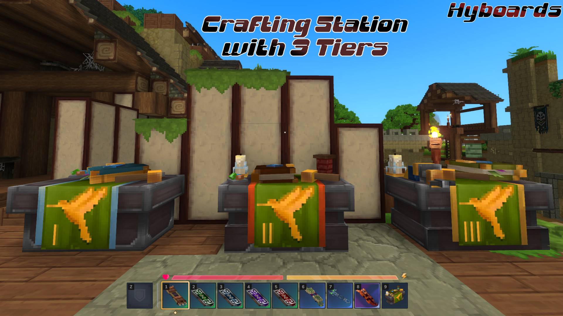 Adds 29 hoverboards to Hytale with unique models per ore tier, a crafting bench with upgrades and custom player animation.
