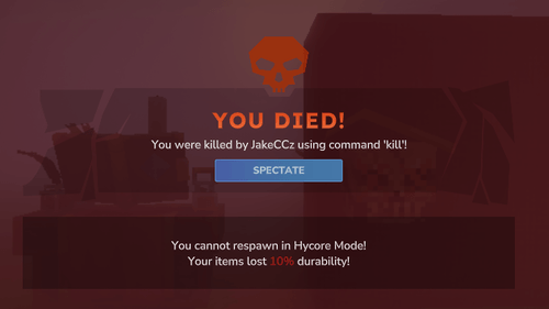 Upon death all Hycore Players will be given the choice to either persist as an idle spectator entity or give up on the world entirely! This is a new custom GameMode added using this plugin called Spectator Mode. In Spectator Mode, you cannot break blocks, you cannot place blocks, you cannot pick up or drop items either, you are stripped of these privileges. What you can do is fly, move around at insanely high speeds and troll people LOL.