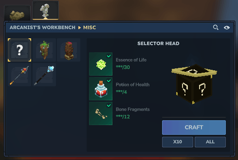The Selector Head Item is a Craftable Revive Head variant, which grants you with another player's revive head on use. Using the Arcanist's Workbench, it can be crafted with 30 Essence of Life, 4 Potions of Health and 12 Bone Fragments.