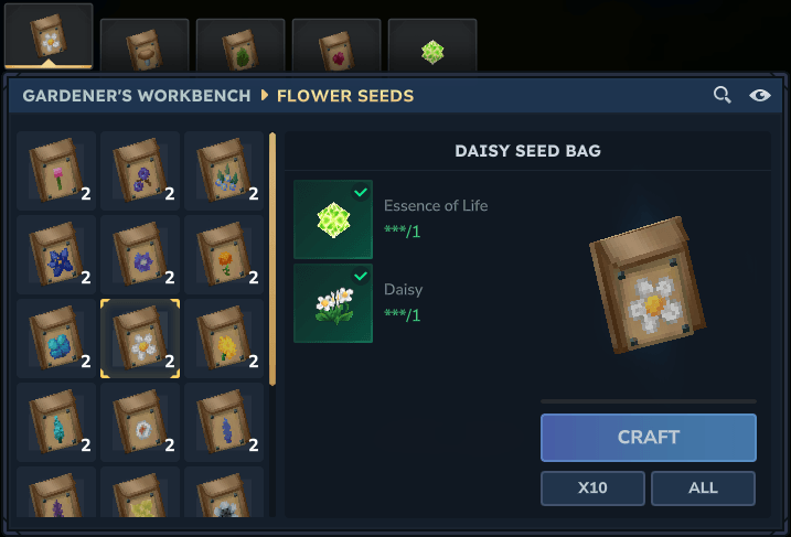 Craft the new seeds by making a gardener's workbench and combining the plant with life essence.