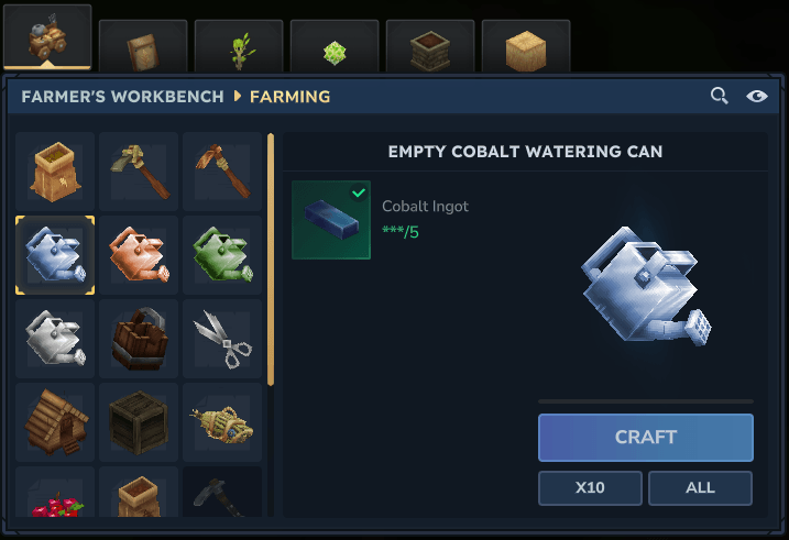 New hoe and watering can tiers going up to adamantite can be crafted at the farmer's workbench.