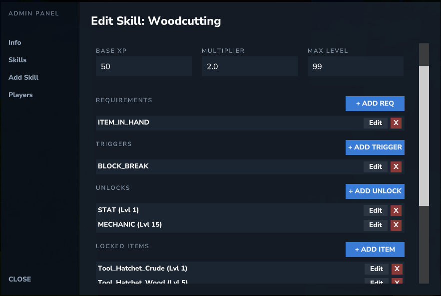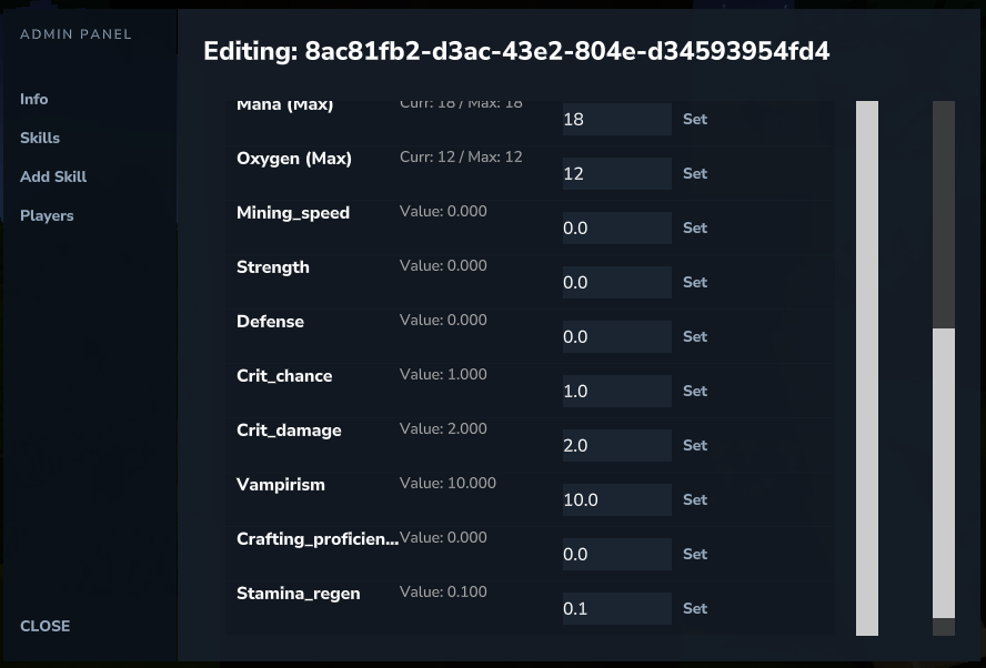 - Players page for editing any players HySkills data from within the menu.