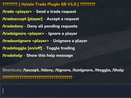 🔑sabo.hytaletrade.use /- to use /tradehelp commands