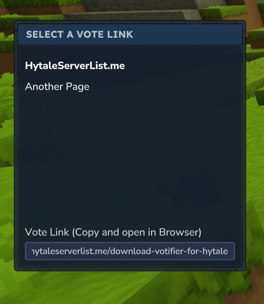 This mod lets you send votes to Hytale servers using both Votifier V1 and Votifier V2 protocols.
